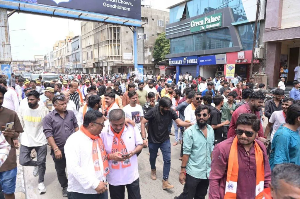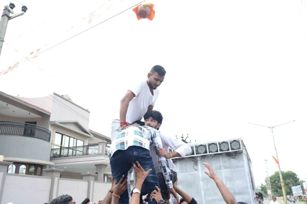ગાંધીધામ ટુડે, ન્યૂઝ : ગાંધીધામમાં વિશ્વ હિન્દુ પરિષદ અને બજરંગદળ દ્વારા જન્માષ્ટમીની ભવ્ય ઉજવણી કરવામાં આવી, જેમાં કુલ 61 મટકીઓ ફોડવામાં આવી. આ ઉત્સવ અંતર્ગત એક વિશાળ શોભાયાત્રા પણ કાઢવામાં આવી હતી, જે લીલાશાહ શિવ મંદિરથી શરૂ થઈને ગાંધીમાર્કેટ, ચાવલા ચોક થઈ ઝંડા ચોક સુધી પહોંચી હતી.